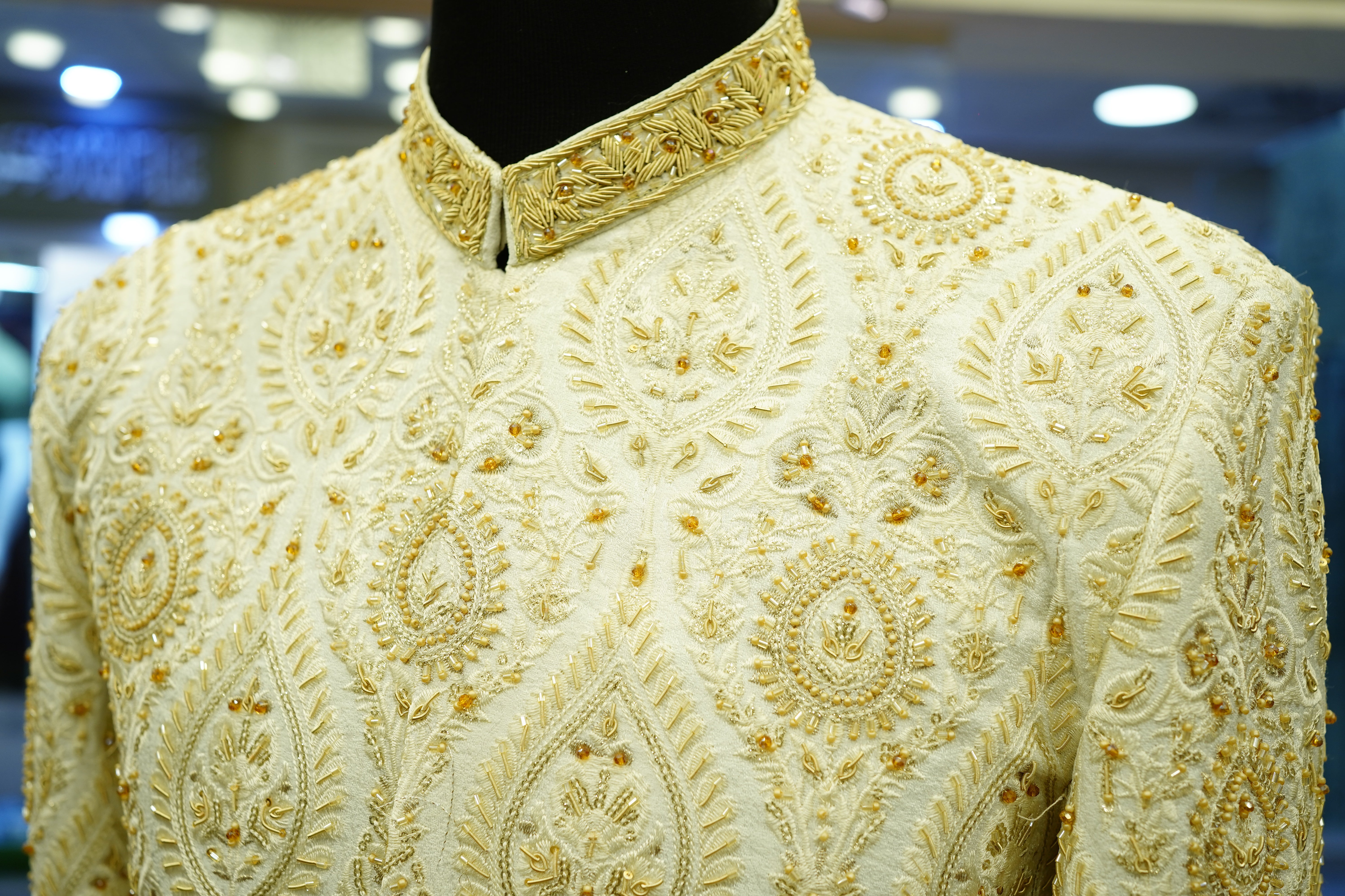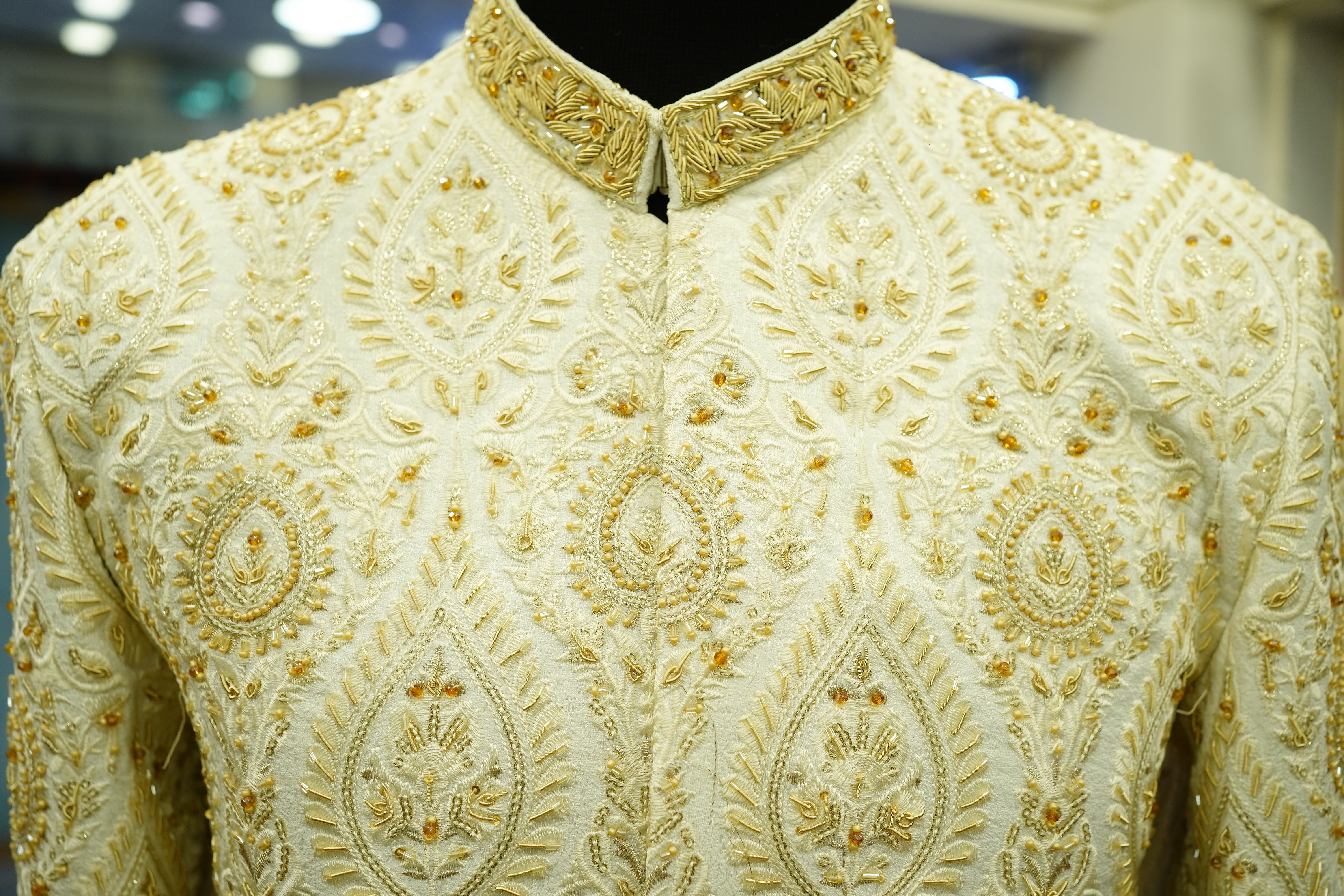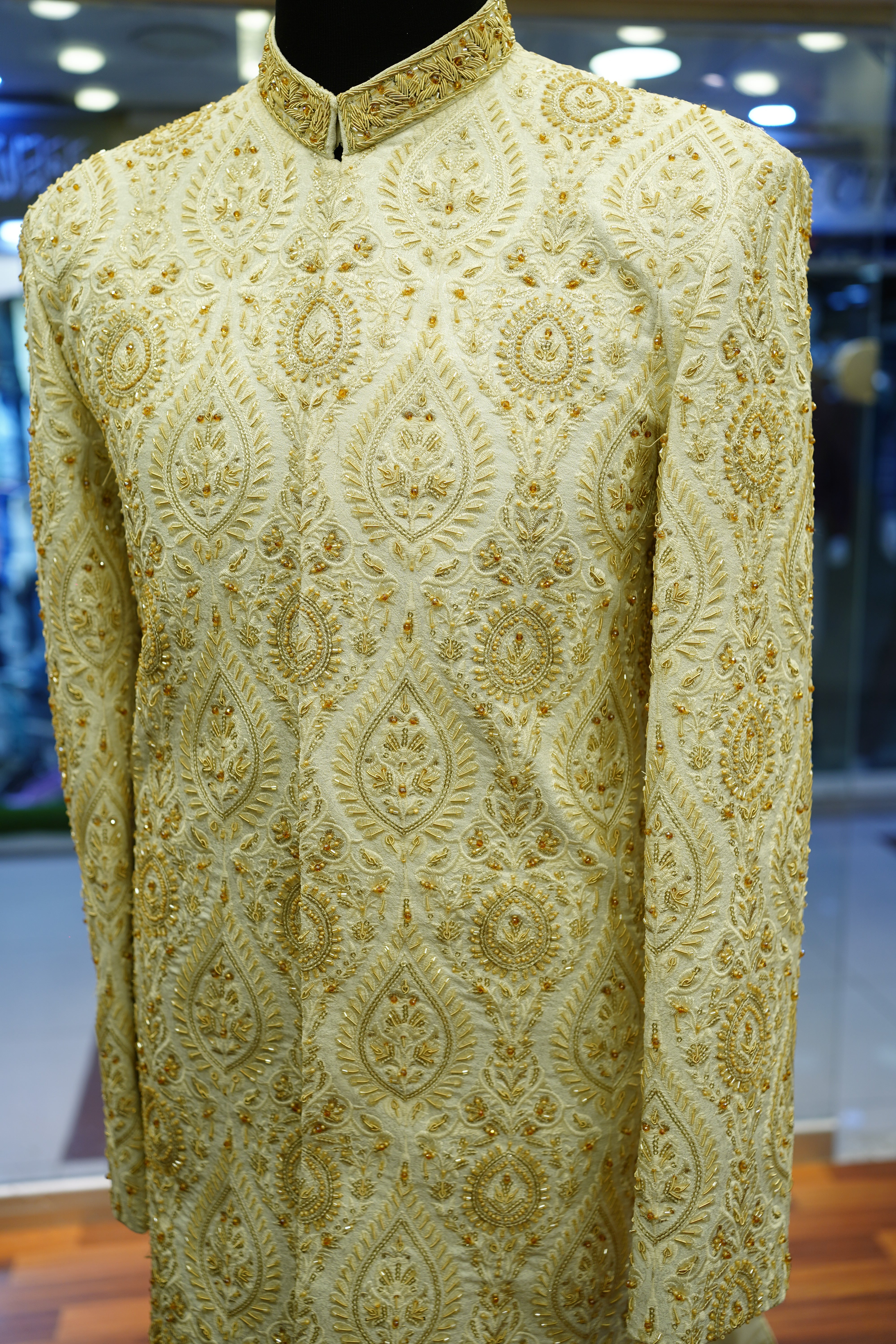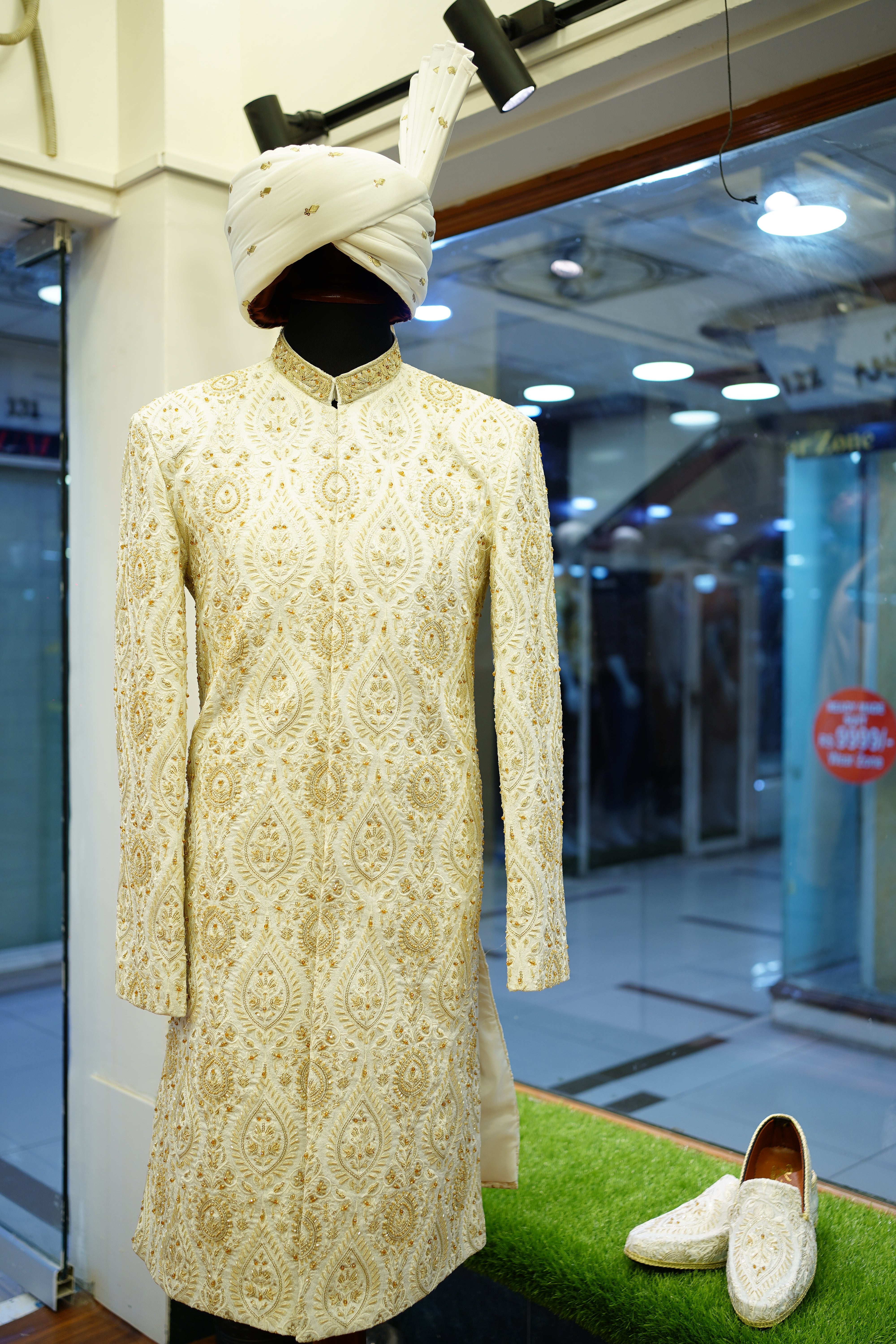 Elevate your traditional wardrobe with this Off-White Messori Sherwani adorned with intricate hand embroidery, complemented by a matching turban and khoosa for a complete, elegant ensemble.mbroidered Sherwani Five-Piece Set, featuring exquisite hand embroidery that highlights intricate craftsmanship. This ensemble combines refined elegance with timeless style, perfectly suited for formal occasions and celebrations. The detailed embroidery adds texture and depth, ensuring a distinguished and sophisticated appearance. Meticulously designed, this set offers a harmonious blend of comfort and luxury, making it an exceptional choice for those who appreciate classic heritage with a contemporary touch.
