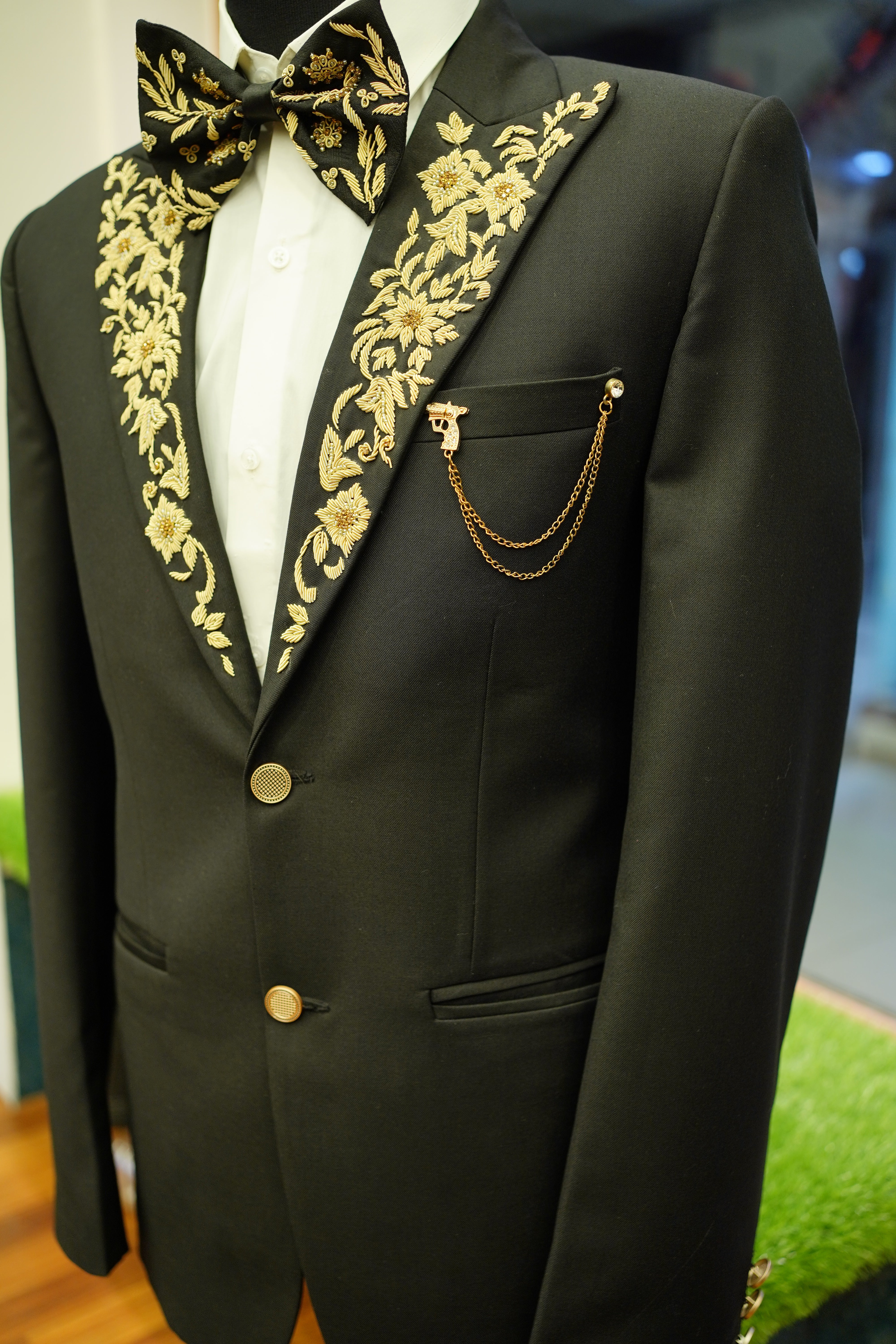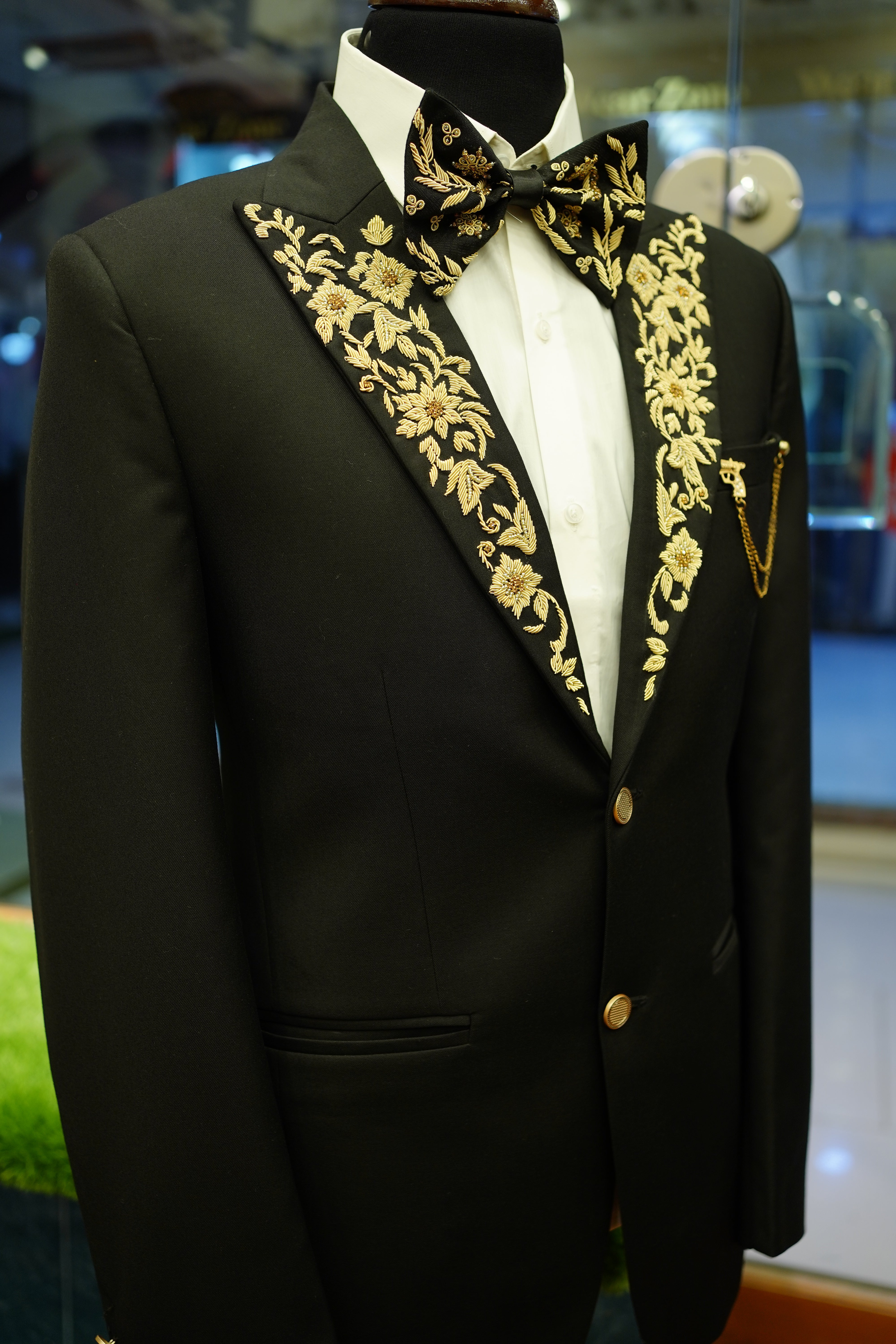 Stand out in style with this Black Embroidered Tuxedo with Golden Floral …