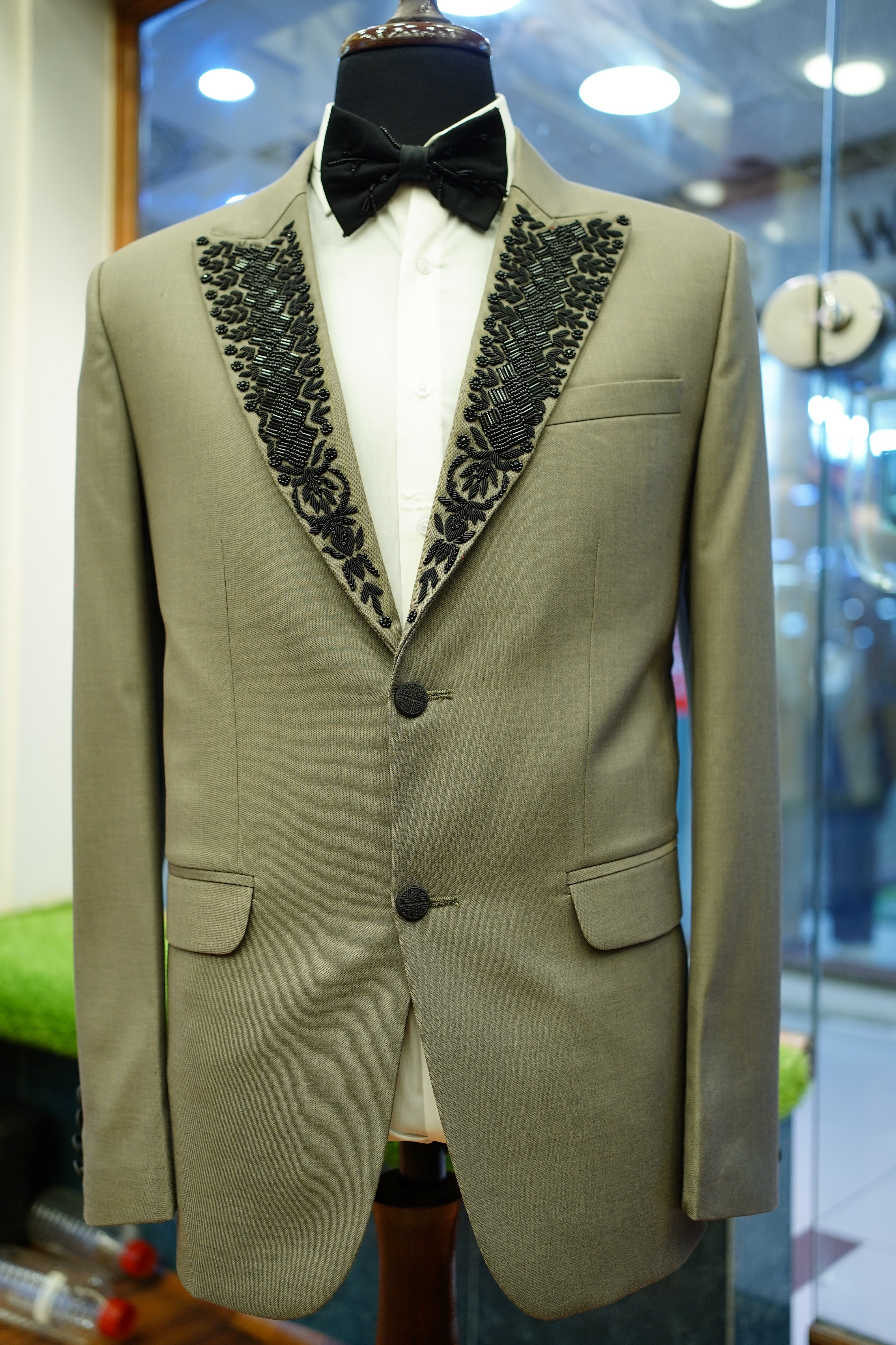 Beige Tuxedo Suit with Black Hand Embroidery