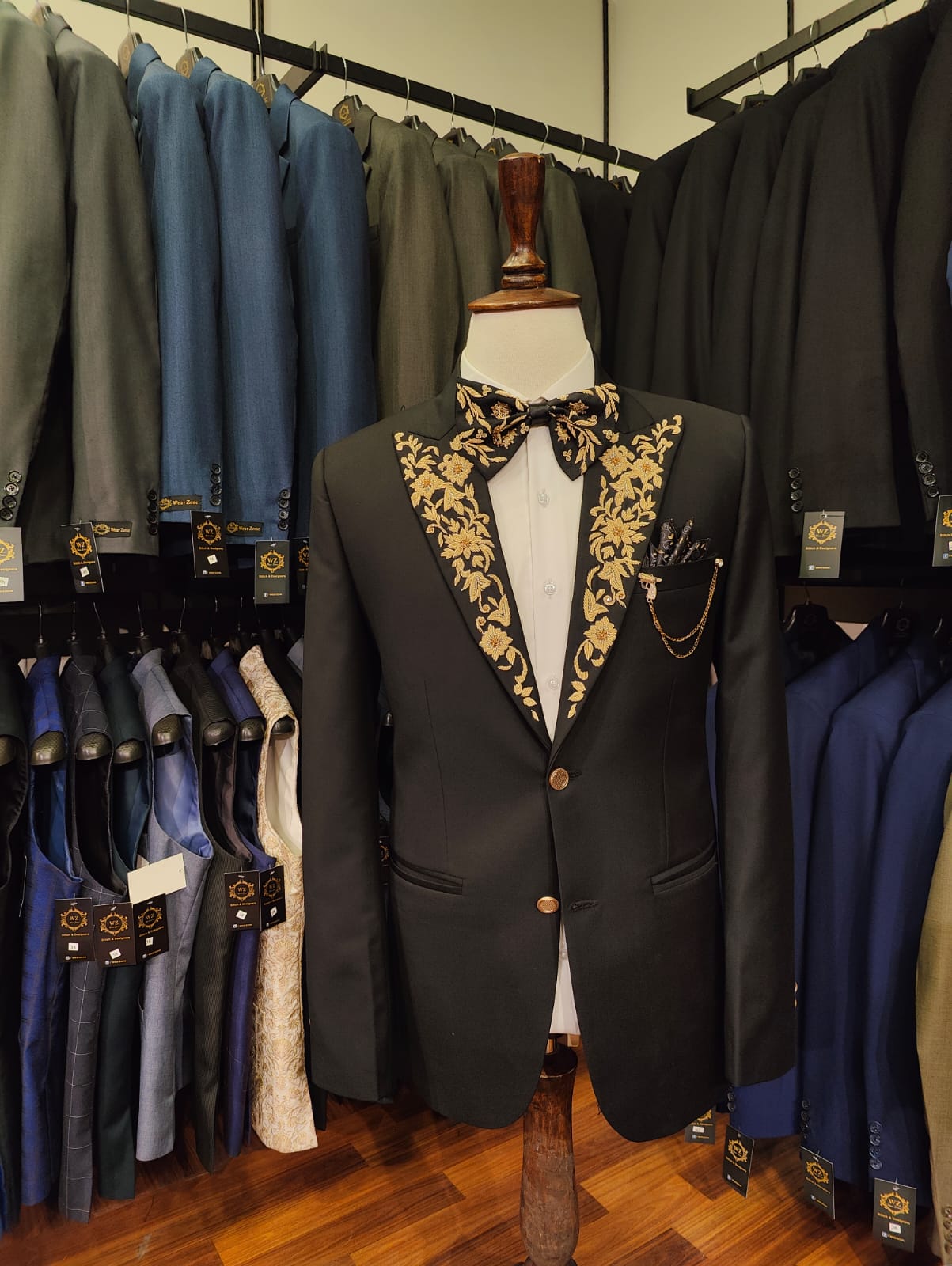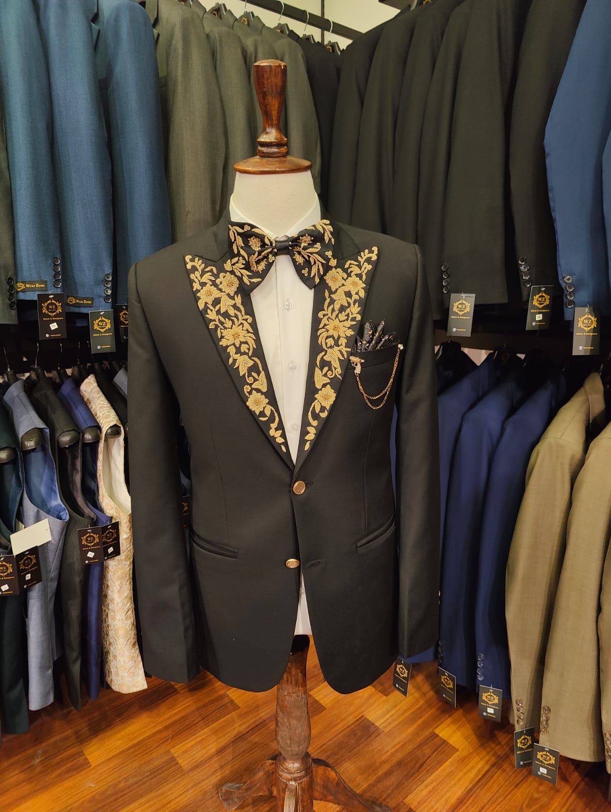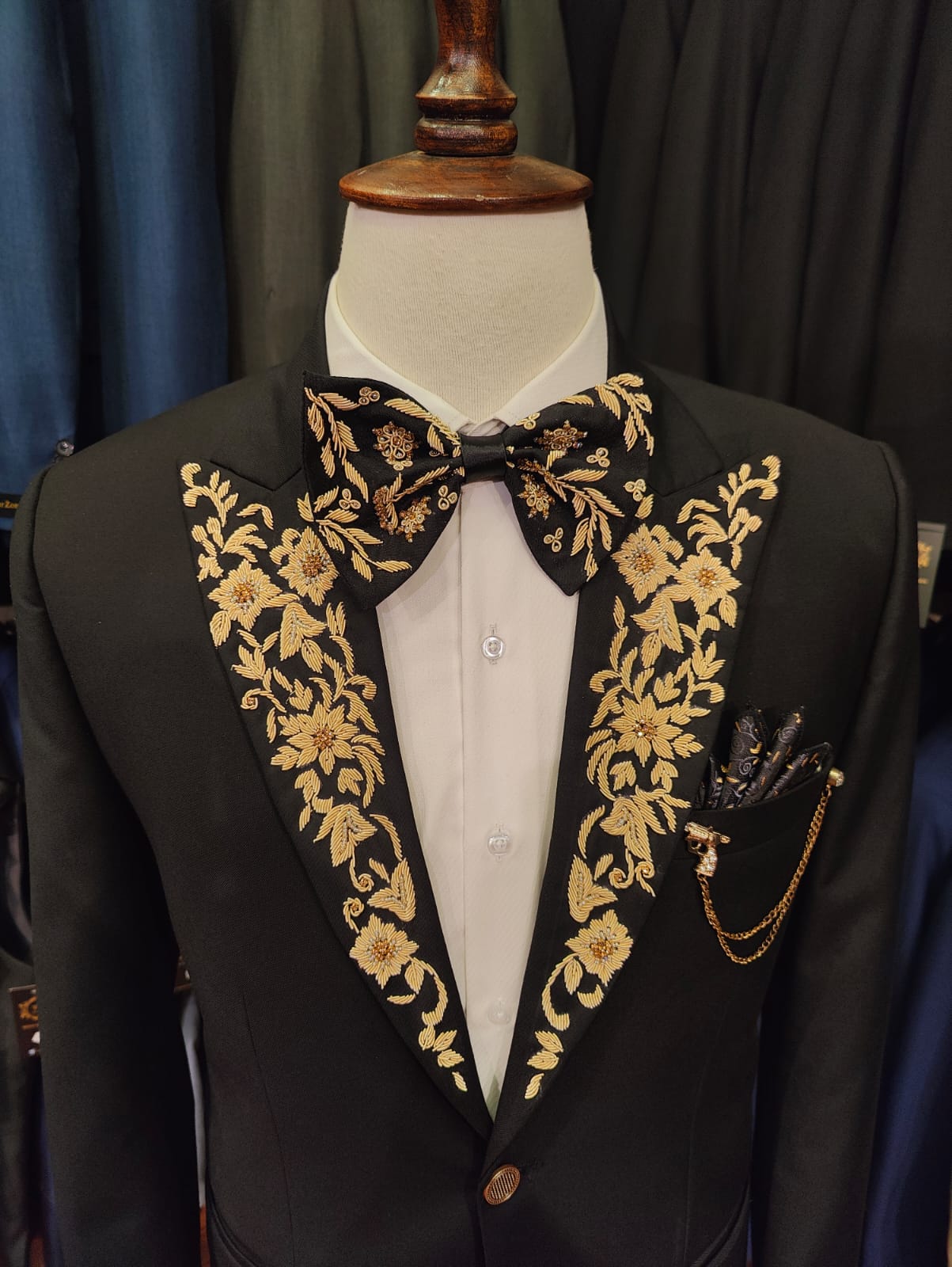 Tailored black tuxedo with golden floral embroidery