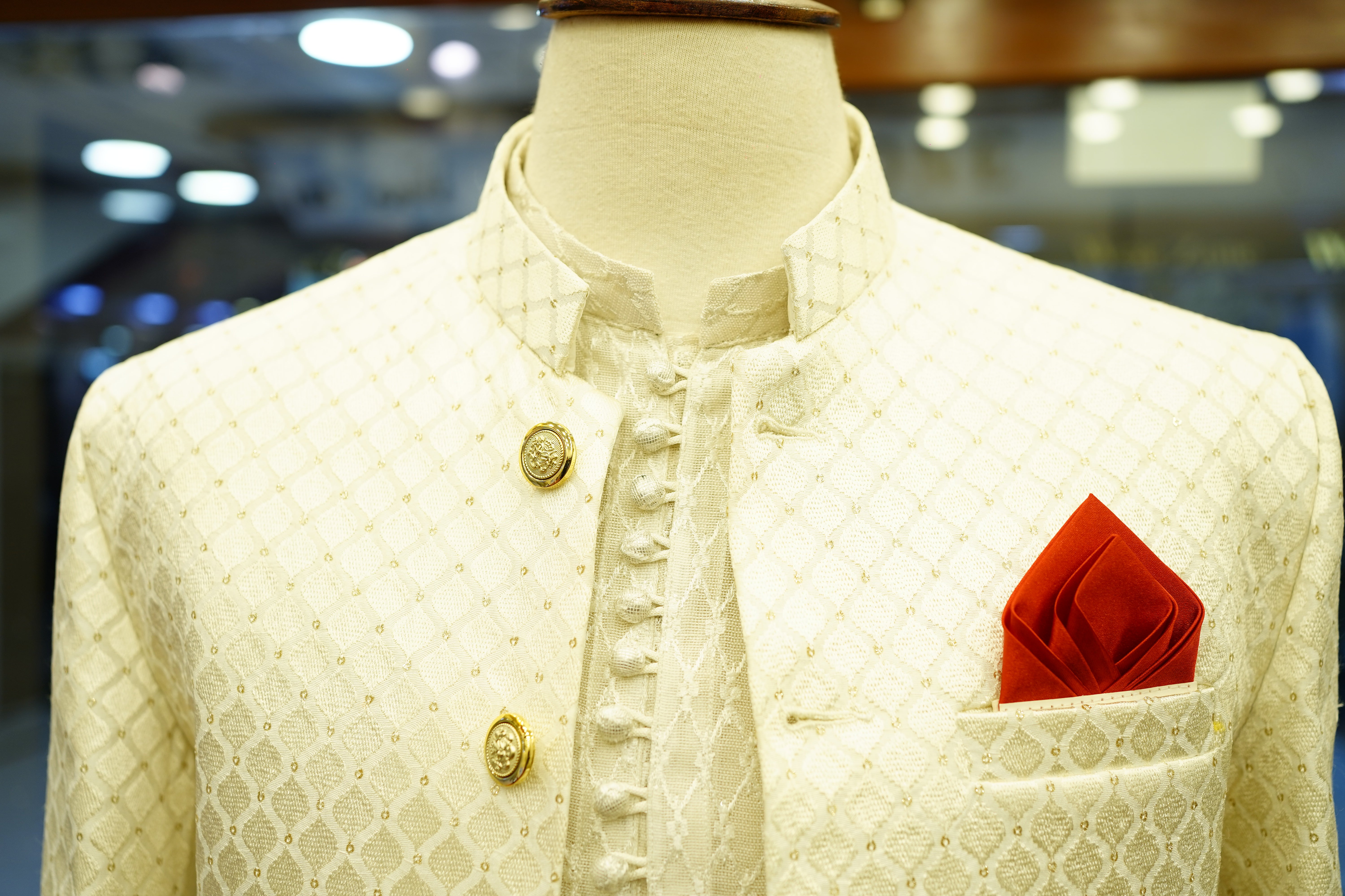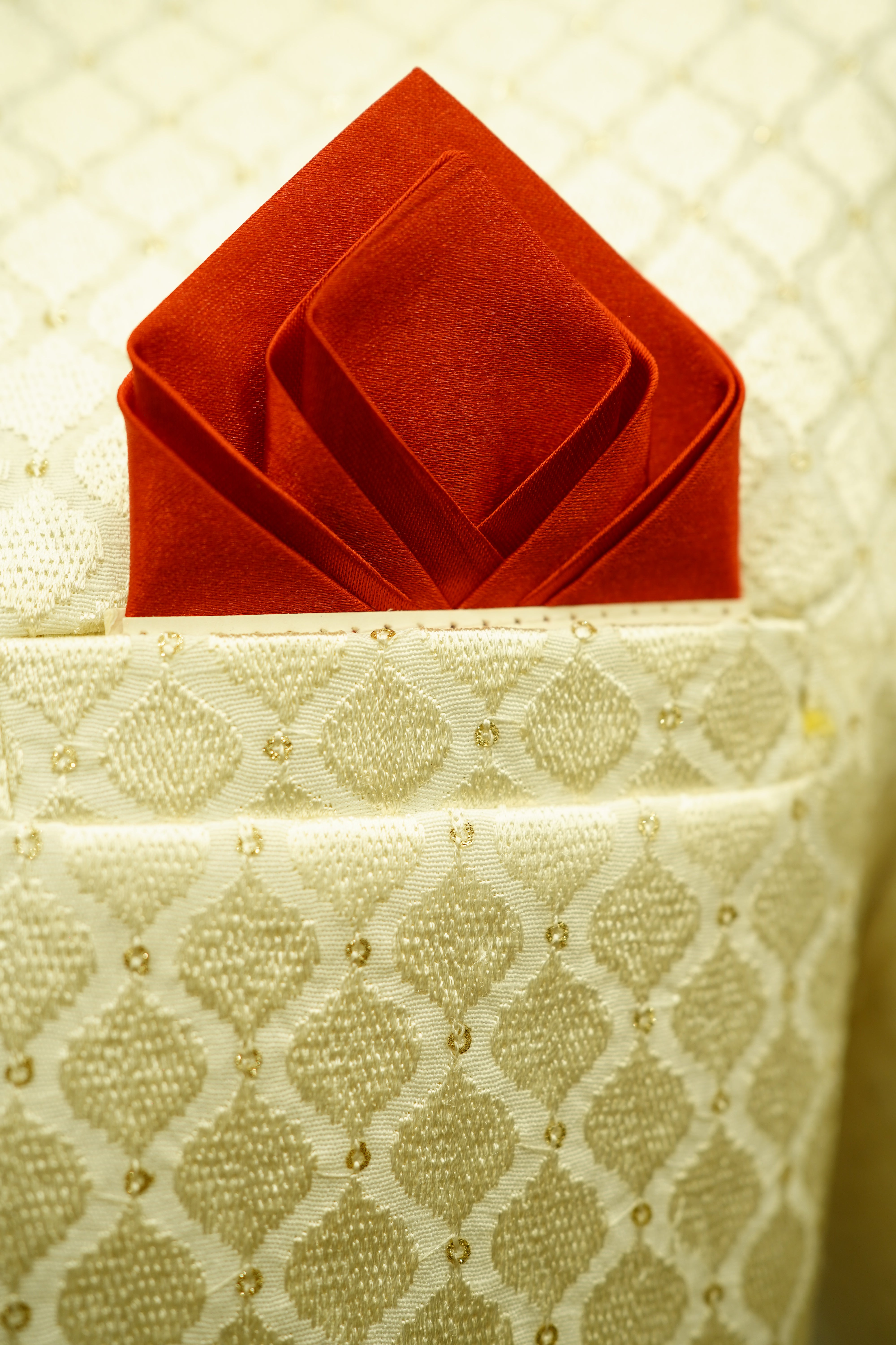 Sophisticated and subtly striking, this off-white prince coat is designed for formal occasions where elegance takes center stage. The rich contrast of the red pocket square adds a bold accent to this timeless ceremonial look.