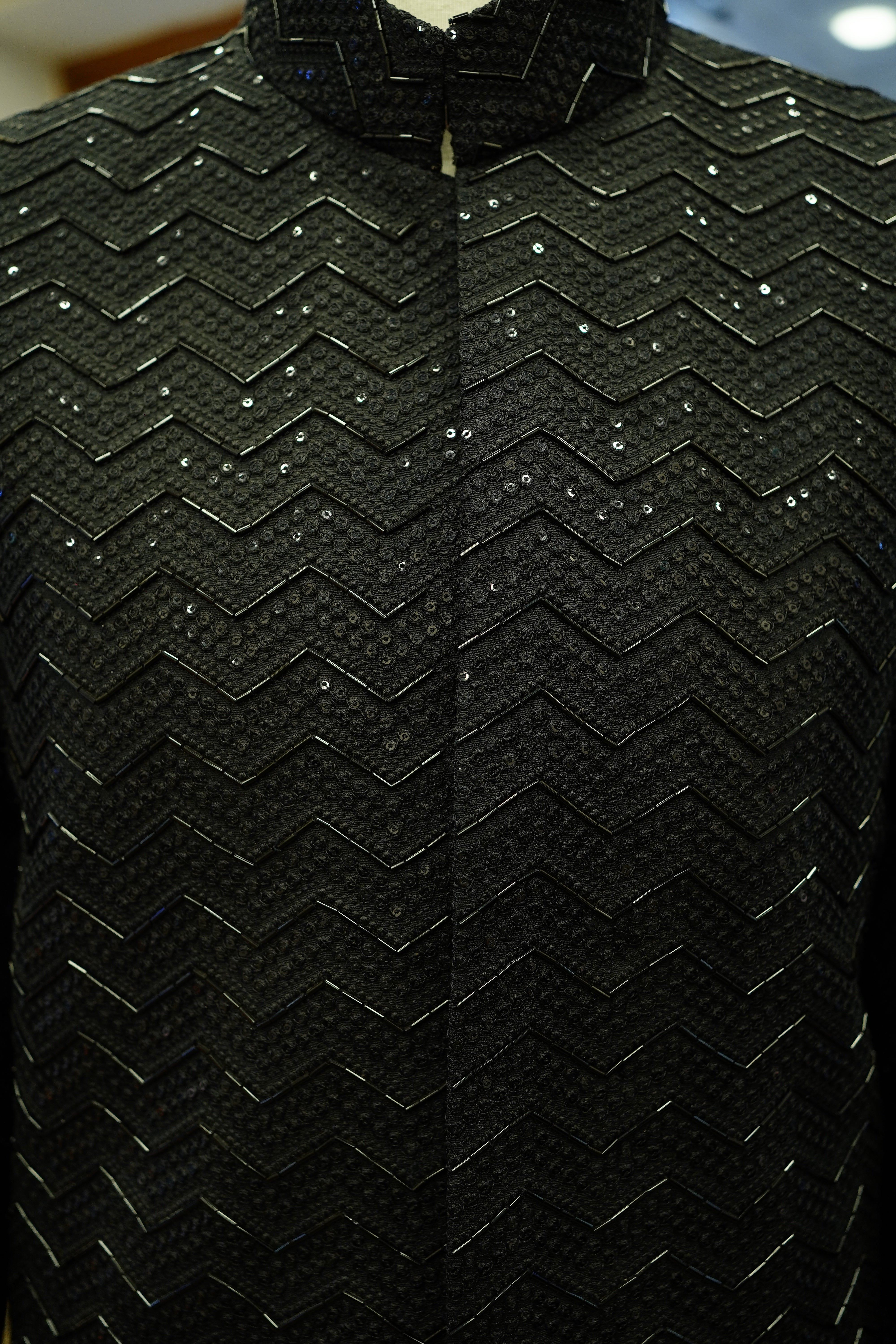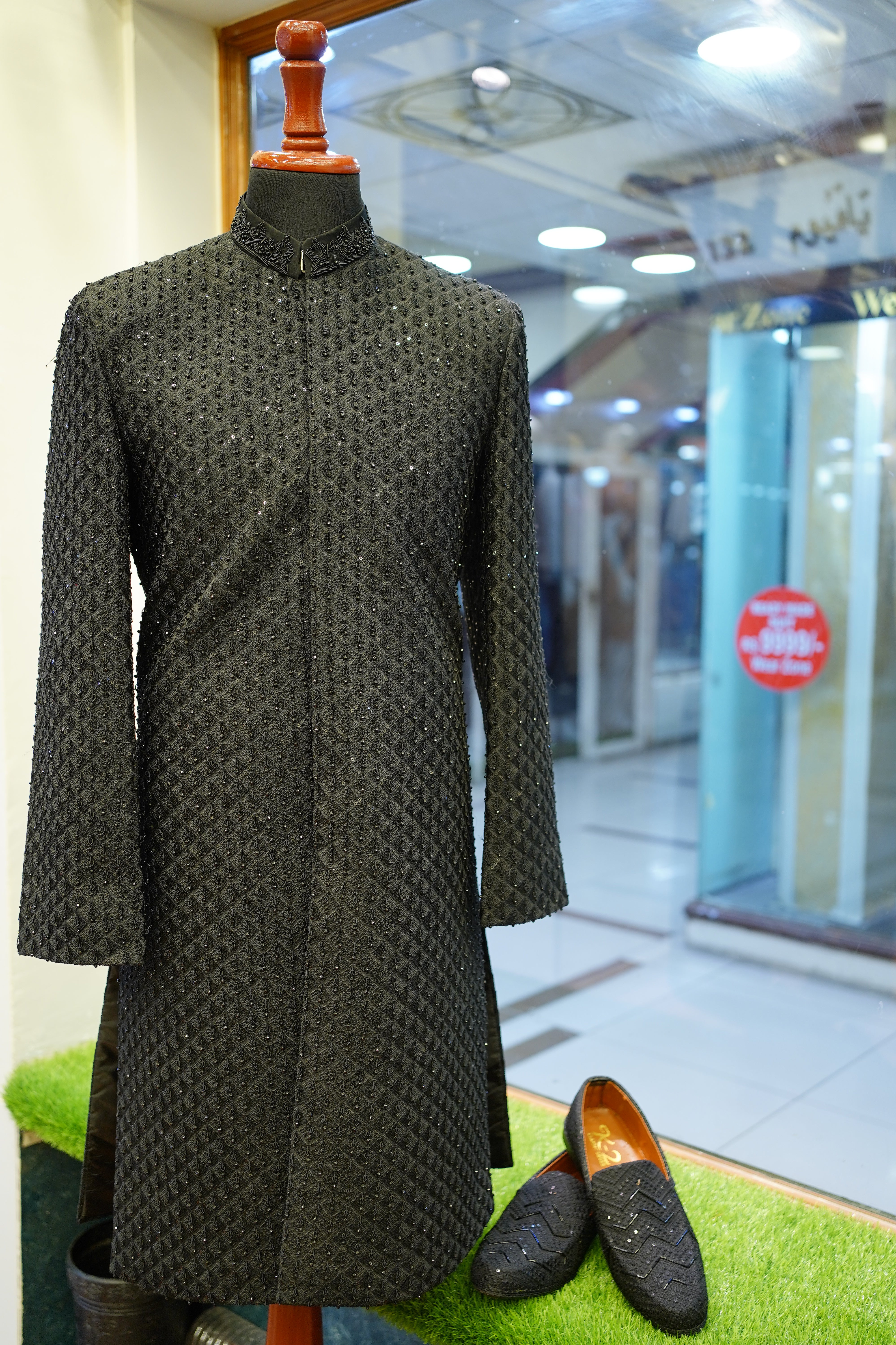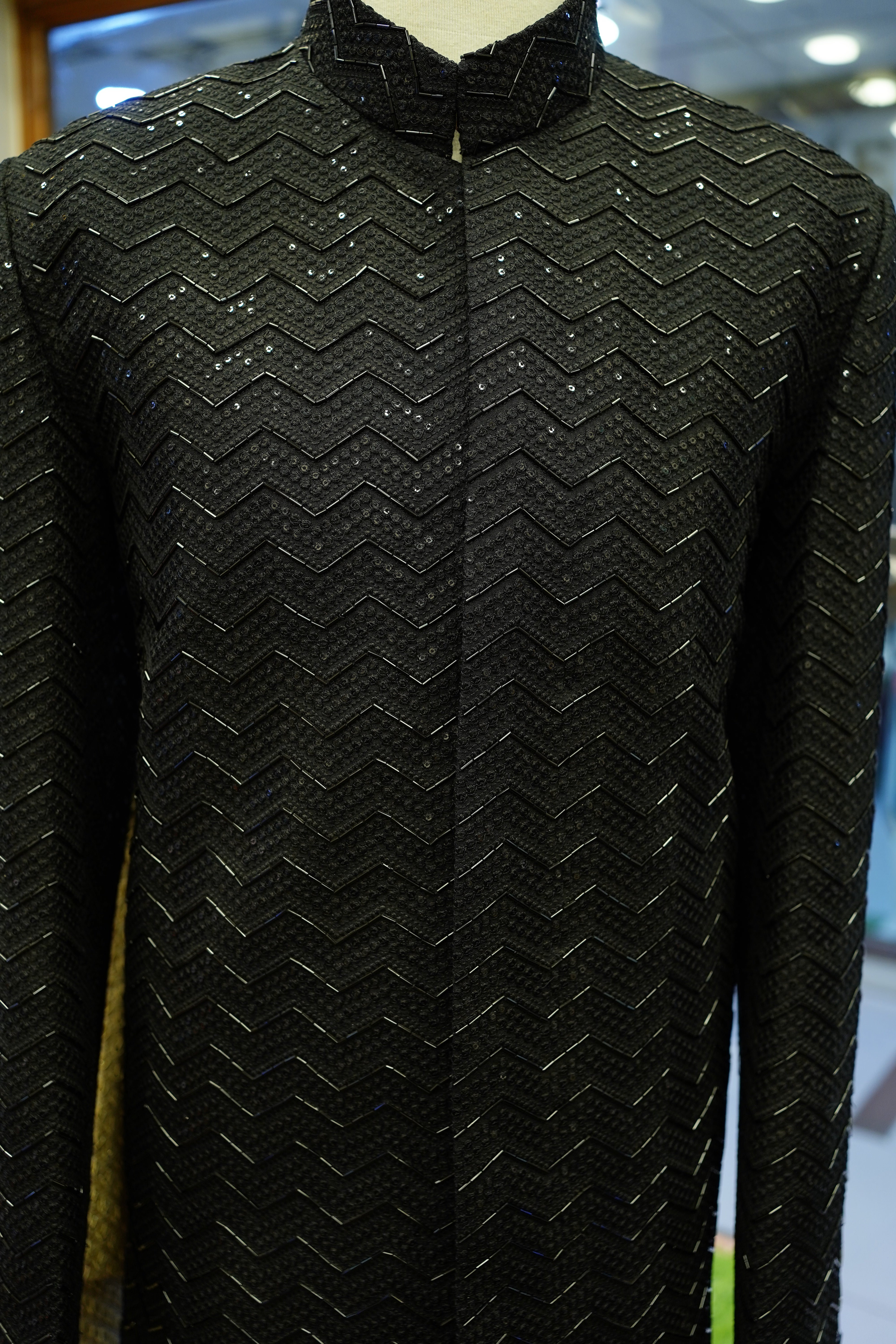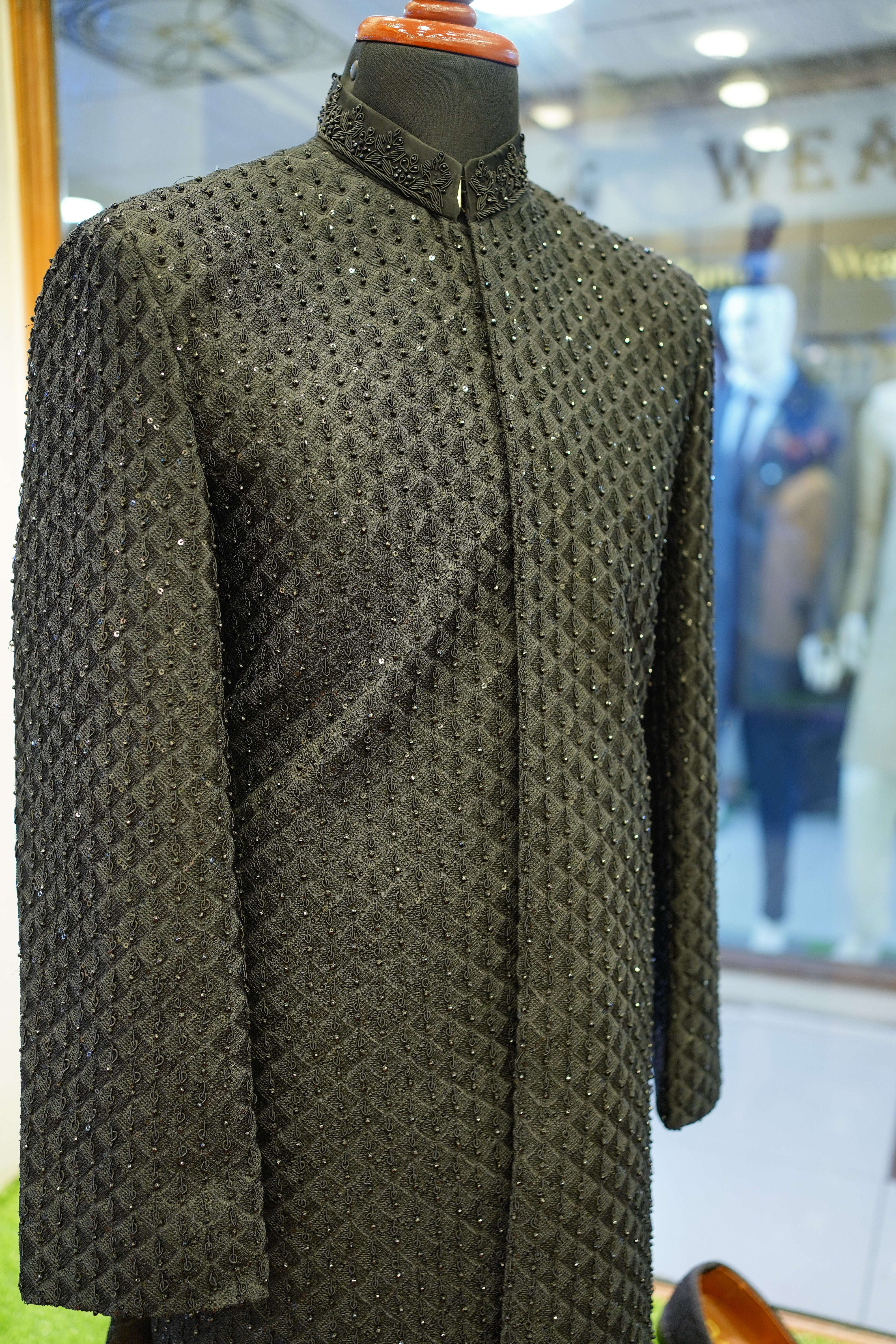 Step into your special day with confidence and royalty in this regal black sherwani ensemble.